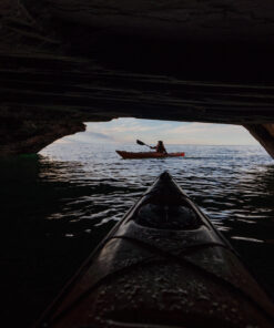 About two miles in, we’ll pause at a sandbar where you can step out to stretch, enjoy snacks or your packed lunch, and even take a swim in the bay’s warmest waters. After this 20–30 minute rest, we head toward Houghton Point, where sandstone cliffs rise into a maze of arches, honeycombed formations, and sheltered caverns. These sea caves are among the most spectacular along the mainland, and you’ll explore them fully from your kayak.
