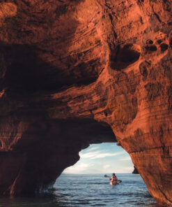 About two miles in, we’ll pause at a sandbar rest stop. Here, you can hop out to stretch, enjoy snacks and lemonade (or your own packed meal), and even take a swim in the bay’s warmest waters. After a 20–30 minute break, we’ll continue on toward the Houghton Point sea caves, a highlight of the Apostle Islands mainland. Intricate arches, caverns, and honeycombed sandstone await, set against the calmest paddling waters the region has to offer.