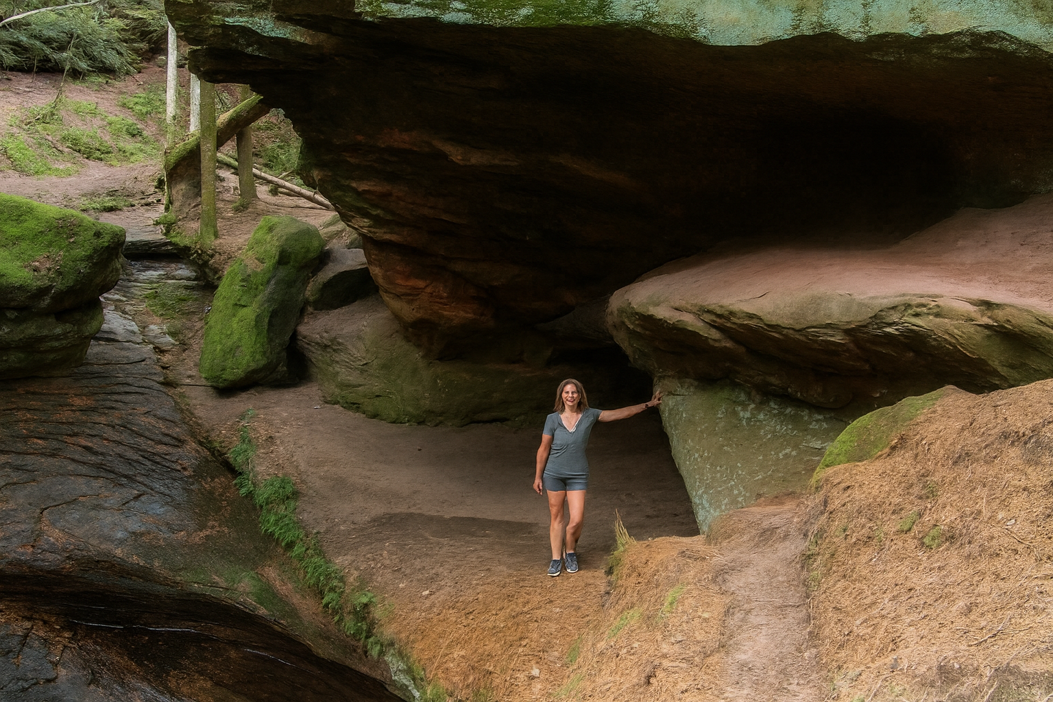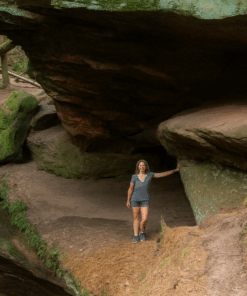 After exploring Houghton Point, you’ll land on the sandstone shoreline of Houghton Falls State Natural Area. From here, the paddling portion ends, and your self-guided adventure begins. A half-mile hike through Echo Dells leads you past waterfalls and rock formations that feel like inland sea caves. The trail is beautiful but includes some steep sections, so good knees and moderate fitness are required.